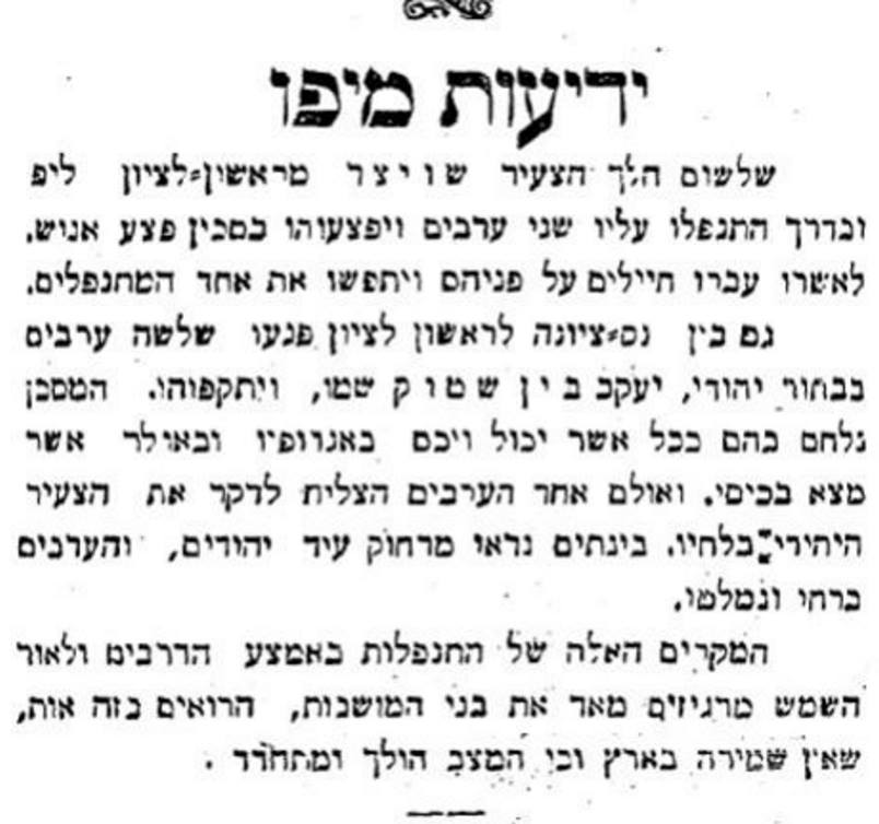 "Позавчера некий молодой швицер из Ришон-Ле-Циона по Яфо, по пути на него напали два араба и смертельно ранили его ножами. Находившиеся поблизости солдаты схватили одного из нападавших.