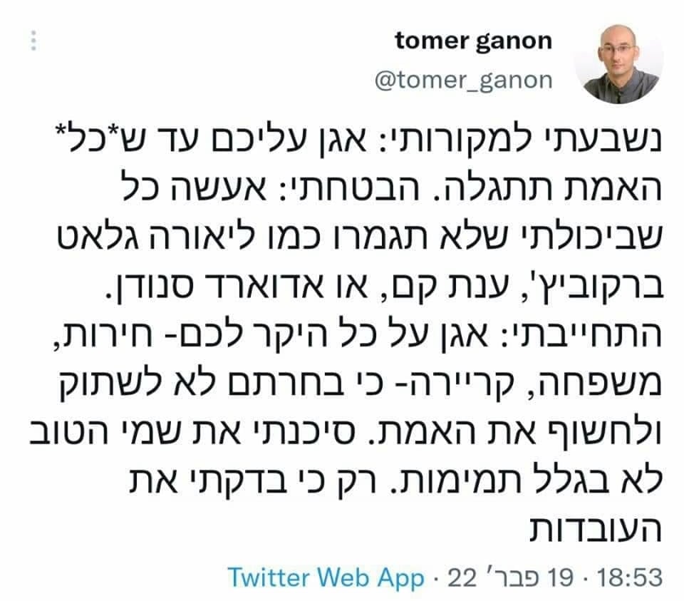 Аккаунты в Твиттере и Фейсбуке Томера Ганона (תומר גנון), журналиста "Калькалиста", разоблачившего историю с "Пегасусом" в Израиле, - с 2 часов ночи удалены из соцсетей.