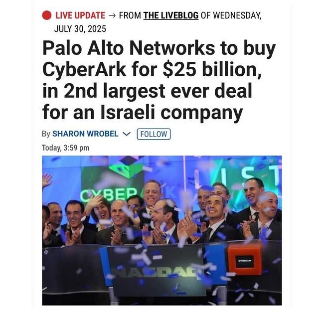 Американская фирма Palo Alto Networks (комьютерная безопаснсть) приобрела израильскую фирму CyberArk (файерволлы) за 25 миллиардов долларов.